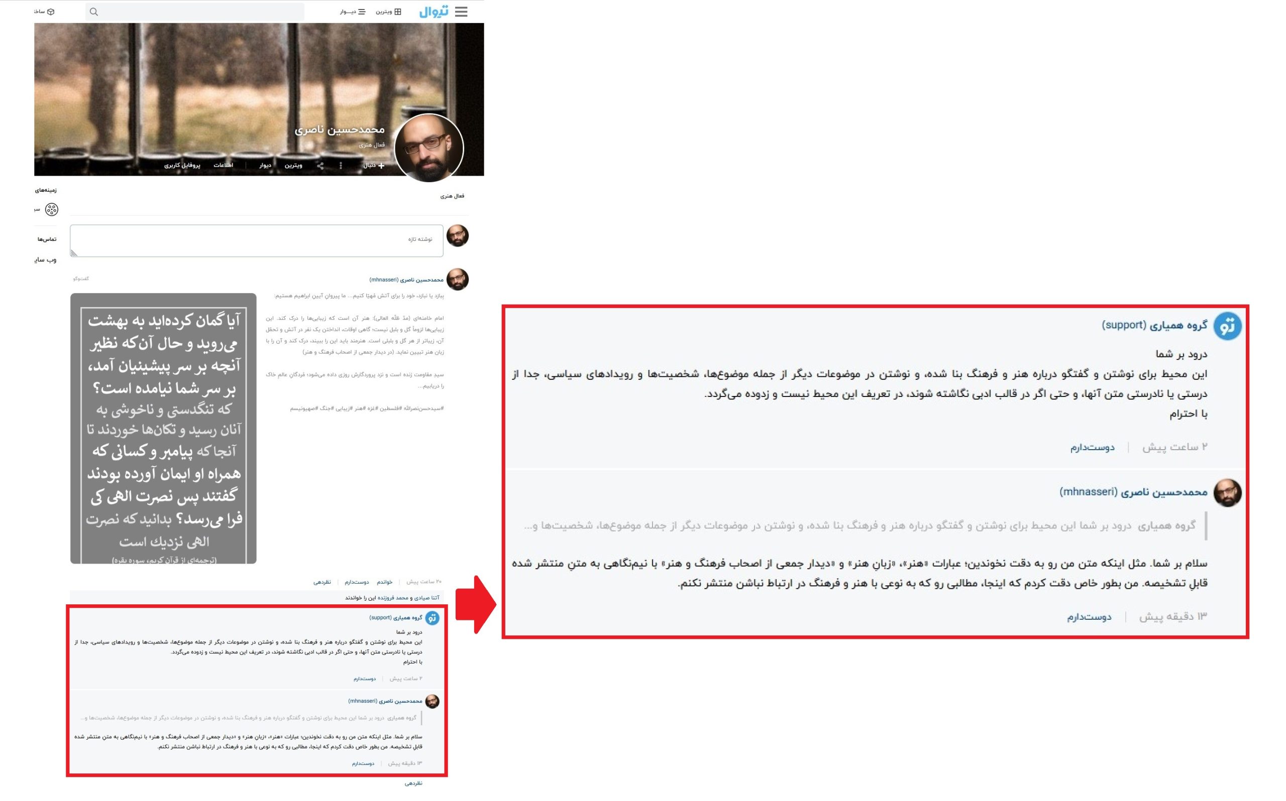 باید به این تهدیدِ «تیوال» به «زدودنْ» به چه شکل نگاه کنم؟ با حُسنِ ظن یا سوء ظن؟ آیا صرفاً بخاطر بیدقتی یا اختلافِ سلیقه این اخطار صادر شده؟ یا اینکه با سیدِ مقاومت، امام خامنهای (مد ظله العالی) یا (خدایِ ناکرده) قرآن مشکلی دارن؟ آیا از نظر قانونی میشه در ارتباط با این موضوع به جایی شکایت بُرد یا نه؟ اگر اطلاع دارین، لطفا به من اطلاع بدین. سپاسگزارم.