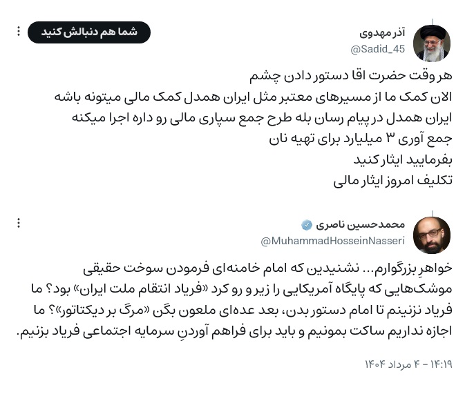 پس از حملۀ رژیم به ایران، توجهاتِ بسیاری (در داخل و خارج از کشور) به پشتیبانیِ اقشارِ مختلفِ مردم از جمهوری اسلامی معطوف شد و بسیاری از این اتفاق، به عنوان یک پیروزی بزرگ یاد کردند. درست، اما در عین حال، این اتفاق نگارنده را به یاد این روایت انداخت: