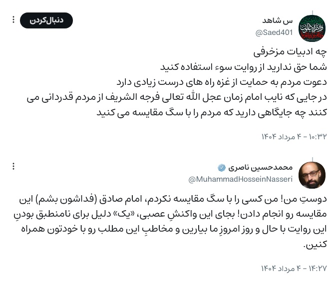 «شما واقعا متوجه نیستین که من موظف به امر به معروف و نهی از منکر هستم یا خودتون رو به نفهمی میزنین؟ یا شایدم فکر میکنین چوپان هستین و دیگران رَمه؟ یکی از اون «صدتا روایت» رو طرح کنین و مخاطبِ این مطلب رو قانع؛ اما اگر نمیتونین در اثباتِ نادرستیِ موضعِ من بُرهان بیارین، ساکت بشین و حرف اضافه نزنین.»